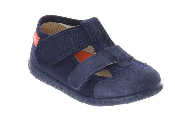 Wykonane z przewiewnej tkaniny bawełnianej, kapcie chłopięce do przedszkola z antypoślizgową podeszwą zapewniają odpowiednią cyrkulację powietrza i chronią przed przegrzaniem stóp. Szeroki nosek umożliwia naturalne ułożenie palców, a wzmocnienie ze skóry w przedniej części cholewki zwiększa trwałość butów i chroni je przed przetarciami.